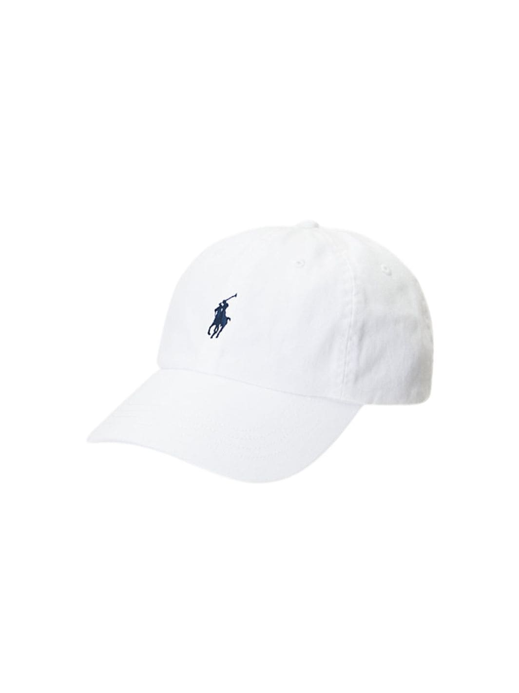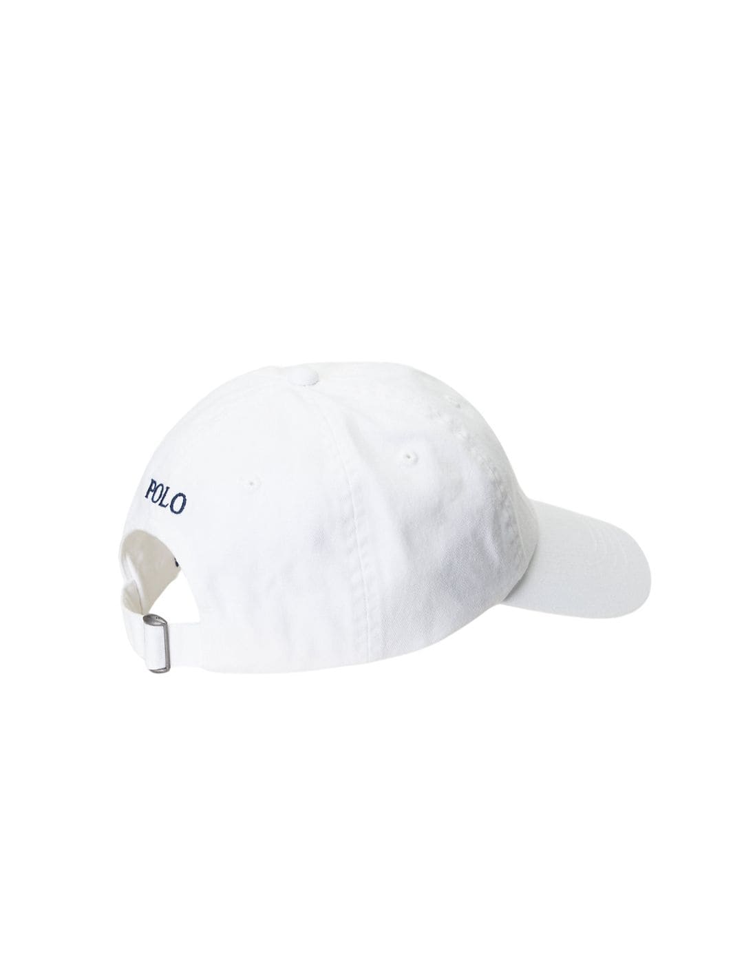 Klassisk hvit base ball cap i bomull med Ralph Laurens signaturbroderte ponni i front og brodert "Polo" og skyvespenne bak.