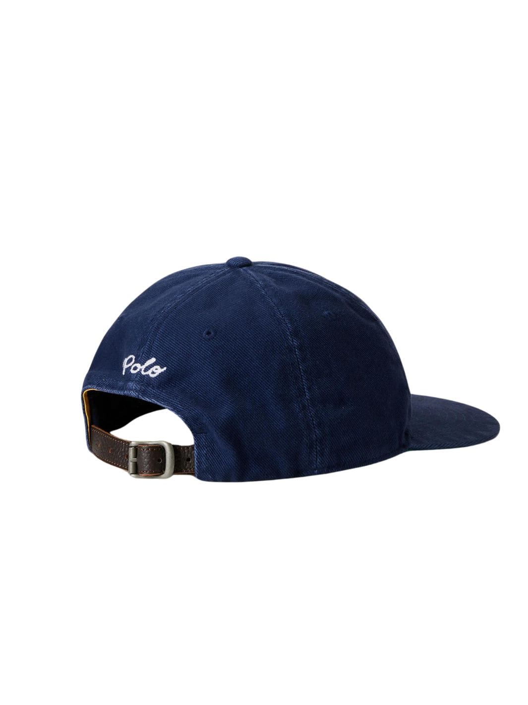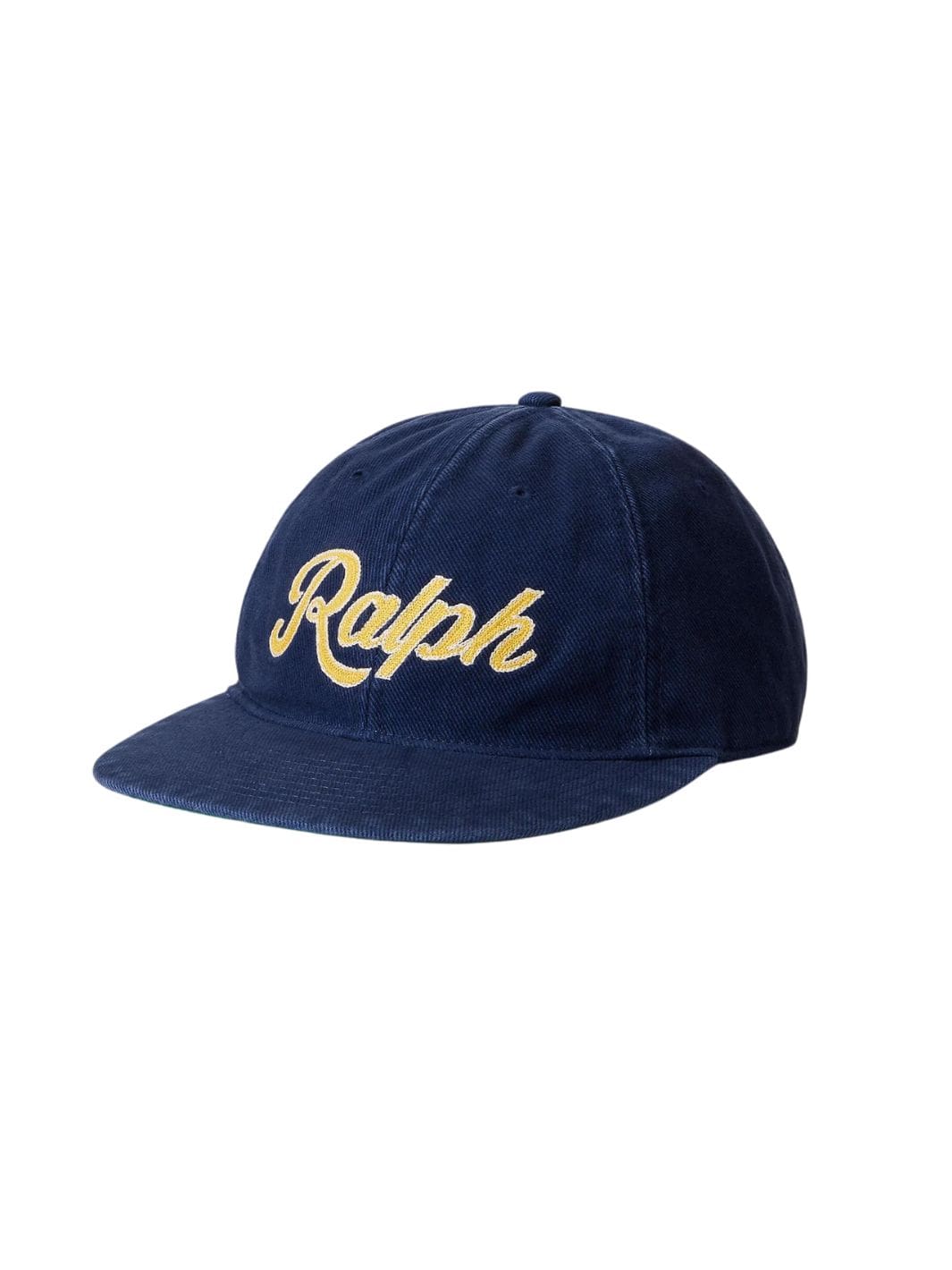Mørkeblå cap i bomullstwill med applikert "Ralph" filtlapp i gult i front og lærreim og logobroderi på baksiden.