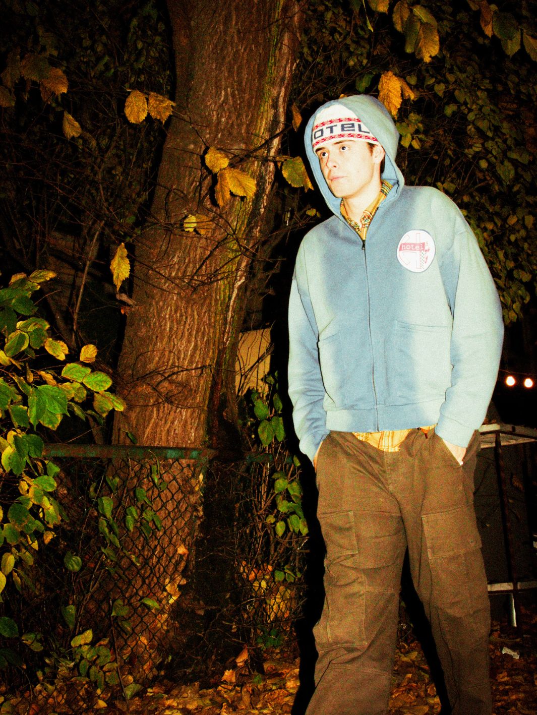 Blå unisex hettejakke med glidelås laget i 100% bomull med sirkelformet logo-trykk på venstre bryst og to store lommer på hver side i front. Jakken har litt vid passform.