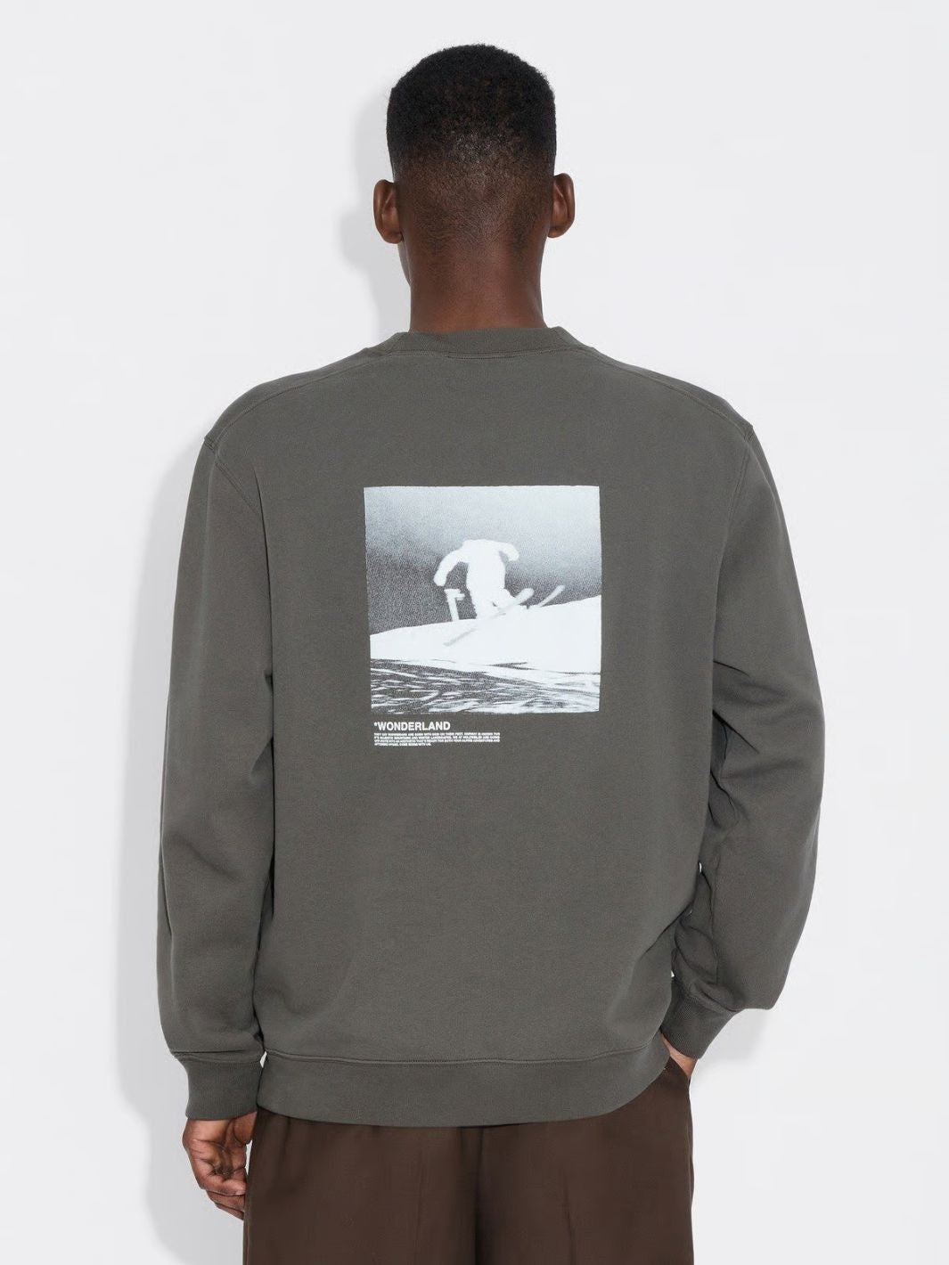 Sort crewneck i 100% økologisk bomull med sesongbasert trykk på ryggen, håndtegnede kunstverk som er inspirert av naturen. Genseren har en ribbet rund hals og normal passform.