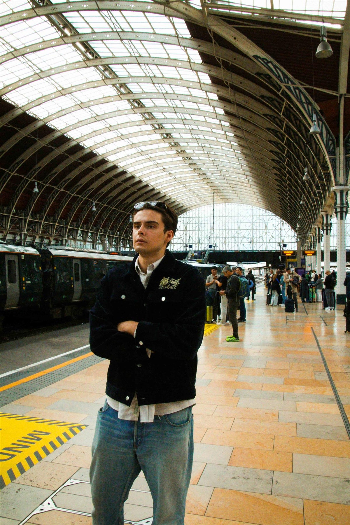 Mørkeblå unisex jakke i kordfløyel med oversized passform og sorte metallknapper i front og på mansjetter, kant nede i siden og brystlommer. Jakken er designet med gult brodert Hotel-Wagon motiv på venstre bryst, klassisk krage, to stykk brystlommer med klaff og knappelukking og skrå stikklommer på hver side.